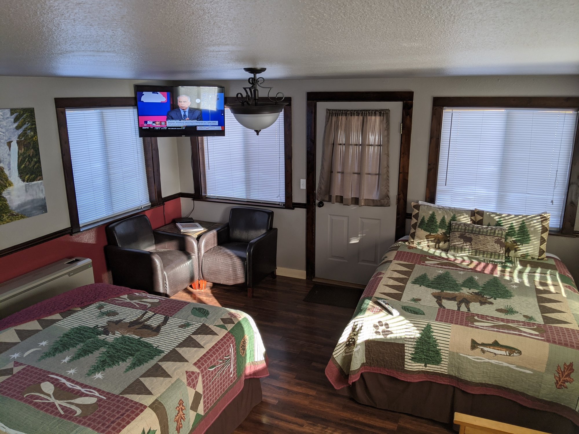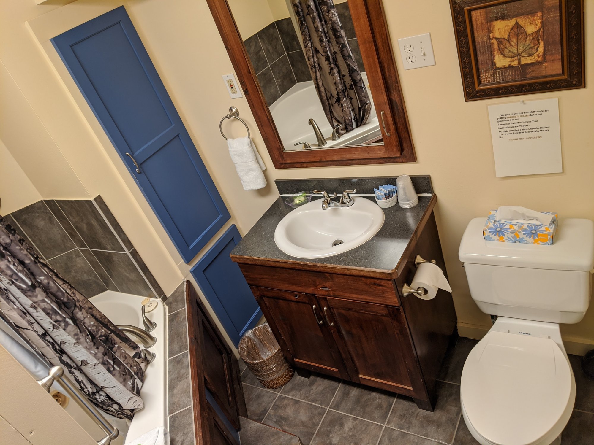 Our Deluxe Cottage Cabin Home has a separate bedroom with a queen bed, a living room with a queen-size futon, and a full bath with Jacuzzi Tub. There are two additional queen-size beds. The full-size kitchen and eating area are equipped with all cooking and eating utensils. This Cabin Home provides you with a private laundry room.
